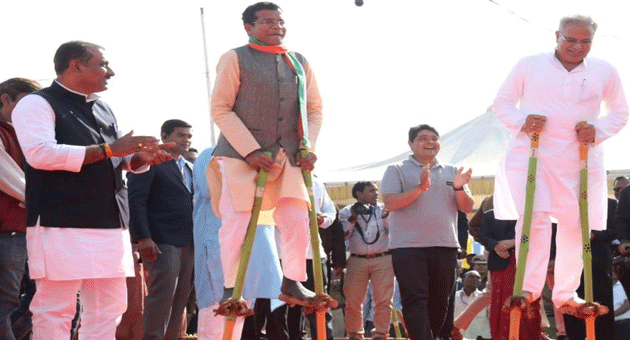 रायपुर। राजधानी रायपुर के साईंस कॉलेज मैदान में स्वामी विवेकानंद की जयंती के अवसर पर आज 12 जनवरी से प्रारंभ हुए तीन दिवसीय राज्य स्तरीय युवा महोत्सव के शुभारंभ के बाद मुख्यमंत्री भूपेश बघेल अतिथियों के साथ मंच के नीचे उतरे और वहां गेड़ी पर चढ़े। युवाओं की तालियों से मैदान गूंज उठा। मुख्यमंत्री के साथ विधायक मोहन मरकाम भी गेंड़ी पर चढ़े। इस अवसर पर युवा कल्याण एवं खेल मंत्री उमेश पटेल भी उपस्थित थे।