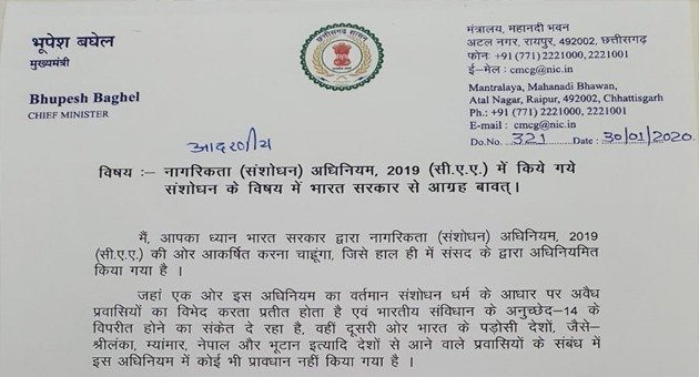 मुख्यमंत्री ने पत्र में कहा है कि छत्तीसगढ़ राज्य में इस अधिनियम के विरूद्ध काफी विरोध प्रदर्शन देखे गये, जो कि शांतिपूर्ण रहे, अपितु इसमें इस प्रदेश के विभिन्न वर्गाें के लोग शामिल हुए। छत्तीसगढ़ में मूलतः अनुसूचित जाति, अनुसूचित जनजाति एवं अन्य पिछड़े वर्ग के निवासी हैं, जिनमें से बड़ी संख्या में गरीब, अशिक्षित एवं साधनविहीन हैं, जिसे इस अधिनियम की औपचारिकता को पूर्ण करने में कठिनाइयों का निश्चित रूप से सामना करना पड़ सकता है। संविधान के समक्ष सभी सम्प्रदाय समान होते हैं, संसद के द्वारा अधिनियमित नागरिकता (संशोधन) अधिनियम, 2019 (सी.ए.ए.) धर्म निरपेक्षता के इस संवैधानिक आधारभूत भावना को खंडित करता दृष्टिगत हो रहा है ।