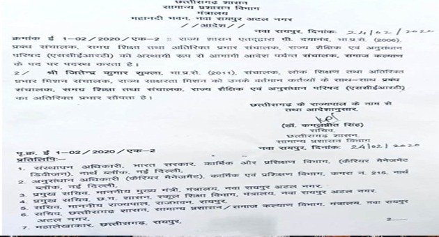 रायपुर(बीएनएस)। राज्य शासन द्वारा भारतीय प्रशासनिक सेवा के दो अधिकारियों के प्रभार में परिवर्तन किया गया है। सामान्य प्रशासन विभाग द्वारा आज मंत्रालय से जारी आदेश के अनुसार पी. दयानंद प्रबंध संचालक समग्र शिक्षा तथा अतिरिक्त प्रभार संचालक राज्य शैक्षिक एवं अनुसंधान परिषद (एससीईआरटी) को संचालक समाज कल्याण के पद पर पदस्थ किया गया है। इसी तरह जितेन्द्र कुमार शुक्ला संचालक लोक शिक्षण तथा अतिरिक्त प्रभार मिशन संचालक, राज्य साक्षरता मिशन को उनके वर्तमान कर्तव्यों के साथ-साथ प्रबंध संचालक समग्र शिक्षा तथा संचालक राज्य शैक्षिक एवं अनुसंधान परिषद (एससीईआरटी) का अतिरिक्त प्रभार सौंपा गया है।