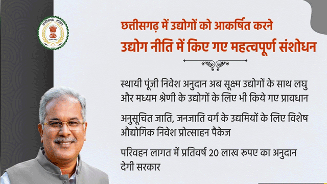 राज्य की नवीन औद्योगिक नीति 2019-24 में मुख्यमंत्री भूपेश बघेल के नेतृत्व में नई सरकार ने 21 महत्वपूर्ण संशोधन अधिसूचित किए हैं। इसमें प्रमुख रूप से लघु उद्योगों को कैपिटल सबसिडी में नगद या जी.एस.टी की पूर्ति का विकल्प होगा। अभी तक यह नगद अनुदान की सूक्ष्म उद्योगों के लिए पात्रता थी। शासन ने विभिन्न औद्योगिक संगठनों की मांगों को स्वीकार करते हुए लघु एवं मध्यम श्रेणी के उद्योगों को नगद या जी.एस.टी में अनुदान देने का निर्णय लिया है। अनूसूचित जाति और अनुसूचित जनजाति श्रेणी के उद्यमियों के लिए विशेष औद्योगिक निवेश प्रोत्साहन पैकेज की घोषणा की गयी है। इसके तहत पिछली औद्योगिक नीतियों से अधिक लाभ दिया जाएगा। पुराने उद्योगों के विस्तार पर भी नए उद्योगों की तरह सरकार प्रोत्साहन देगी। उद्योगों को अब राज्य से अन्य देशों से निर्यात करने के लिए परिवहन में पैसा लगता था। उसमें सरकार परिवहन लागत में अनुदान देगी। इसके तहत प्रतिवर्ष 20 लाख रूपए का अनुदान सरकार देगी।