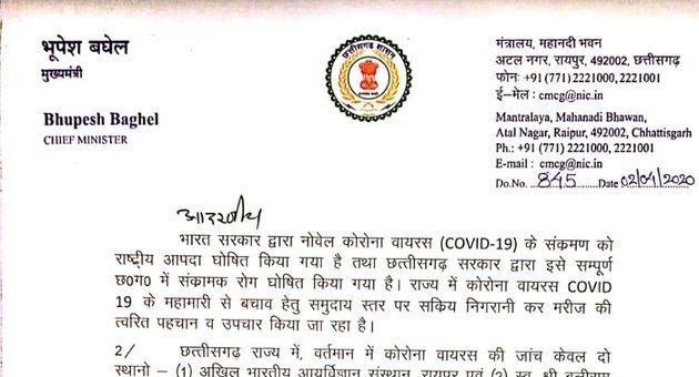 मुख्यमंत्री ने पत्र में लिखा है कि भारत सरकार द्वारा नोवेल कोरोना वायरस के संक्रमण को राष्ट्रीय आपदा घोषित किया गया है तथा छत्तीसगढ़ सरकार द्वारा इसे सम्पूर्ण छत्तीसगढ़ में संक्रामक रोग घोषित किया गया है। राज्य में कोरोना वायरस (कोविड-19) के महामारी से बचाव हेतु समुदाय स्तर पर सक्रिय निगरानी कर मरीज की त्वरित पहचान व उपचार किया जा रहा है।