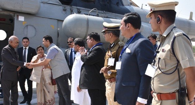 रायपुर(बीएनएस)। राष्ट्रपति रामनाथ कोविंद भारतीय वायुसेना की तीन हेलीकाप्टर के काफिले के साथ आज 01 मार्च को दो दिवसीय प्रवास पर जिला मुख्यालय बिलासपुर के पंडित सुन्दर लाल शर्मा मुक्त विश्वविद्यालय स्थित हेलीपेड पहुंचे। राष्ट्रपति श्री कोविंद के साथ छत्तीसगढ़ के राज्यपाल अनुसुईया उईके भी पहुंची। राज्य शासन की ओर से प्रदेश के उच्च शिक्षा मंत्री उमेश पटेल ने हेलीपेड में राष्ट्रपति श्री कोविंद की अगुवानी की और उनका हार्दिक स्वागत किया। इस मौके पर राज्यपाल के सचिव सोनमणी बोरा भी मौजूद थे।