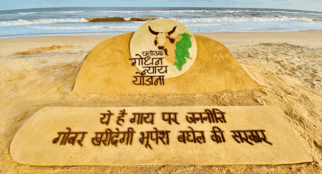 रायपुर(बीएनएस)। छत्तीसगढ़ सरकार द्वारा आज हरेली पर्व से राज्य में शुरू की गई गोधन न्याय योजना को देश-प्रदेश मे अच्छी प्रतिक्रिया मिल रही है। देश में गोबर खरीदने की अपनी तरह की पहली और अनूठी इस योजना पर प्रसिद्ध सैंड आर्टिस्ट सुदर्शन पटनायक ने पुरी में समुद्र तट पर इस योजना की आकर्षक कलाकृृति उकेर कर मुख्यमंत्री को इसके लिए बधाई दी। वही प्रदेश के मुख्यमंत्री भूपेश बघेल, मंत्रीगणों, विधायकगणों सहित बड़ी संख्या में आमजनों ने सोशल मीडिया में अपना प्रोफाईल पिक्चर में गोधन न्याय योजना के लोगो को लगाकर इस ऐतिहासिक योजना को रेखाकिंत किया है। आम लोगों ने ट्वीटर और फेसबुक में योजना पर अपनी सकारात्मक प्रतिक्रिया व्यक्त करते हुए गोधन न्याय योजना के लोगों को अपने प्रोफाईल फोटो पर जगह दी है।